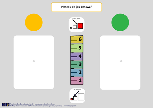Un plateau de jeu pour poser les cartes et comparer. Les deux emplacements où poser les cartes nécessitent de coller un scratch pour éviter qu'elles ne tombent. En haut de ce plateau de jeu, il y a deux pastilles : une verte et une jaune. Elles permettent d'indiquer, par pointage oculaire, quel joueur a gagné.