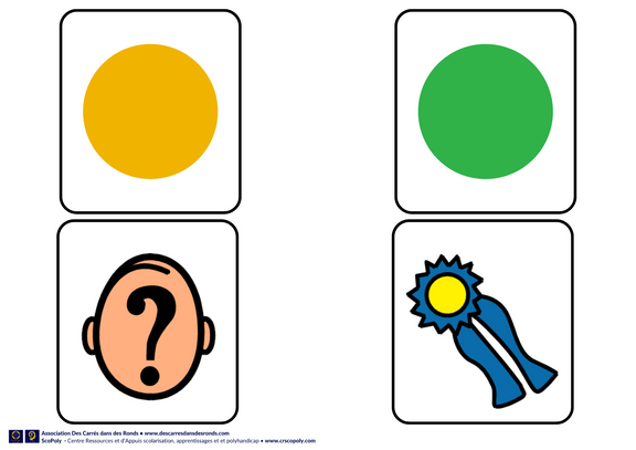 On compare les nombres, ou la taille des chiens, ou la longueur du fond coloré qui les accompagne. Le joueur ayant le chien le plus grand récupère les cartes des autres joueurs. On demande "qui gagne ?" pour que l'enfant pointe la bonne couleur. Ici, c'est le chien de la pastille jaune. On peut également demander "Est-ce que c'est ce chien qui gagne ?" et l'enfant répond par oui ou non.
