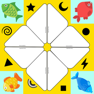 Découper les poissons, chiffres et symboles. Prévoir une réglette de communication pour les personnes avec un pointage digital et un cadre de communication pour les personnes qui communiquent par pointage visuel.